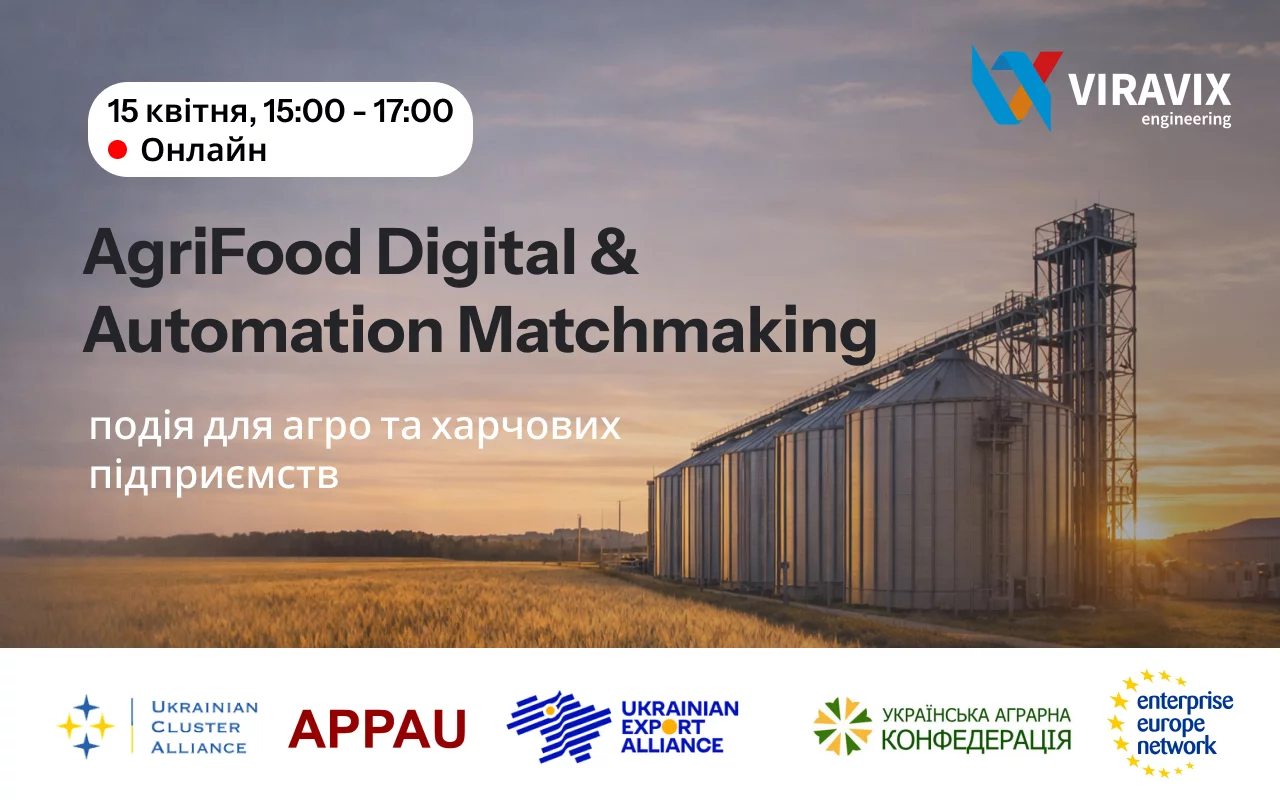 Am 15. April findet das Online-Event AgriFood Matchmaking Event statt, das Unternehmen aus der Agrar- und Lebensmittelbranche mit Integratoren und Engineering-Unternehmen aus der Ukraine zusammenbringt. Das Team von Viravix wird ebenfalls teilnehmen und praktische Erfahrungen im Umgang mit Produktionsprozessen teilen.