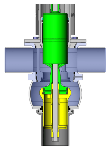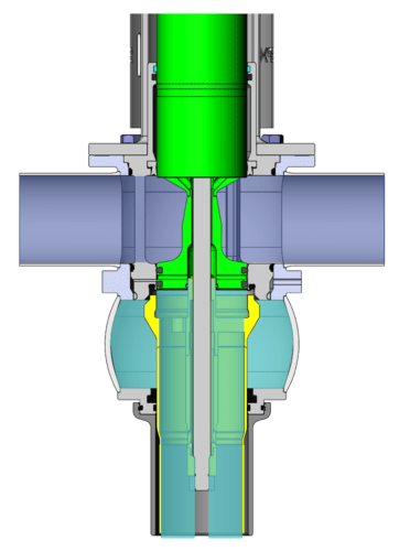 A vented atmospheric cavity between the seats provides dual protection: it acts as a drain in case of seal failure and removes CIP fluid during cleaning cycles. During seat lift movement, integrated flow paths allow CIP to clean exposed product-contact surfaces, including the upper balancer—no external adapters or piping are required. This ensures reliable hygienic separation and efficient CIP performance.