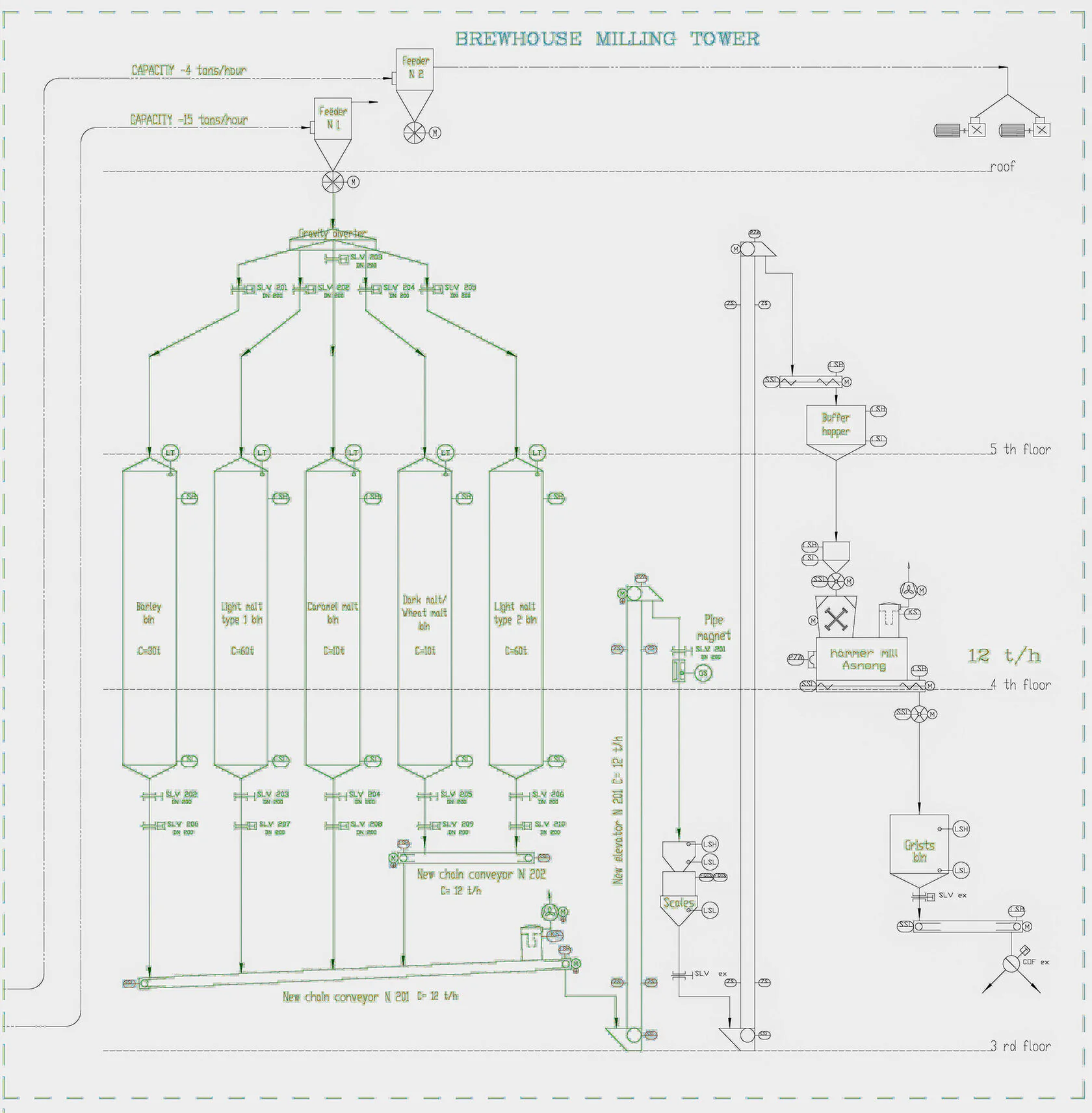 Для кожного виду сировини (солод 3х видів та ячмінь) були передбачені окремі силоси. Солод і ячмінь подаються пневмотранспортером в силоси. Подача регулюється заслінками. Місткість бункерів дає запас сировини на добу для потреб виробництва варильного ділянки пивоварного заводу. Заповнення силосу реалізовано за допомогою циклону приймача та системи пневмотранспорту. Розподіл зерна бункерами здійснюється за допомогою самопливного розподільника, обладнаного автоматичними шиберами.